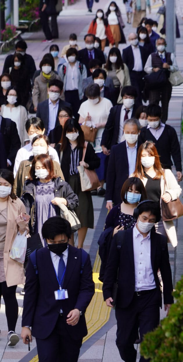 30日朝も東京・豊洲はマスク姿で出勤する会社員らが列をなしていた。午前9時ごろ東京都心を走っていた電車内は、なお…