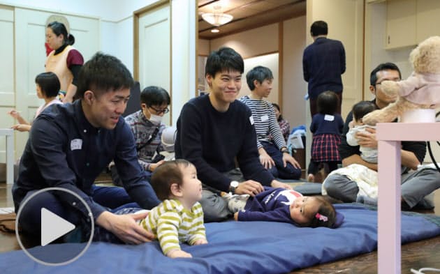 2月の週末、横浜市の助産院を抱っこひもで子どもを連れた父親たちが次々と訪れた。ハイハイで動き回る赤…