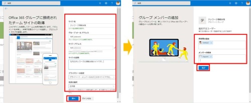 次の画面でチームサイト名やURL、サイトの説明やアクセスの範囲などを指定し、「次へ」をクリックする(図4)。「プライバシーの設定」では、ユーザーに限定した「プライベート」またはOffice 365の組織内のユーザーなら誰でも確認できる「パブリック」を選ぶことができる。次の画面でユーザーを追加して「完了」をクリックすると、チームサイトが作成される。