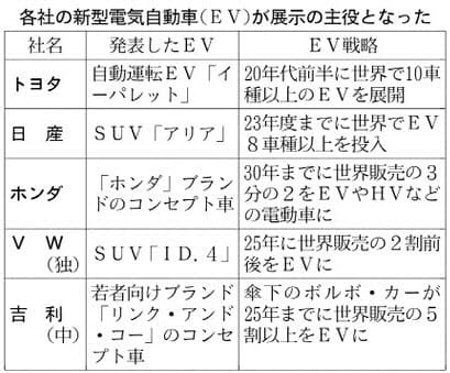 欧米系では中国でシェア首位のVWが世界戦略車で、10月に中国で発売する多目的スポーツ車(SUV)のEV「ID.4」などを発表。米フォード・モーターもSUVのEV「マスタング・マッハE」を発表した。