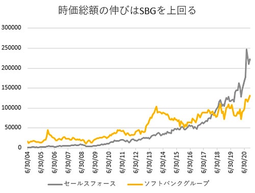 ちなみに日本企業の時価総額トップはトヨタの23兆987億円(2日の終値ベース)で、ほぼ肩を並べる規模になる。急成長した日本企業の代表格であるソフトバンクグループの時価総額と同期間で比較(グラフ参照)すると、その成長力の高さが分かる。