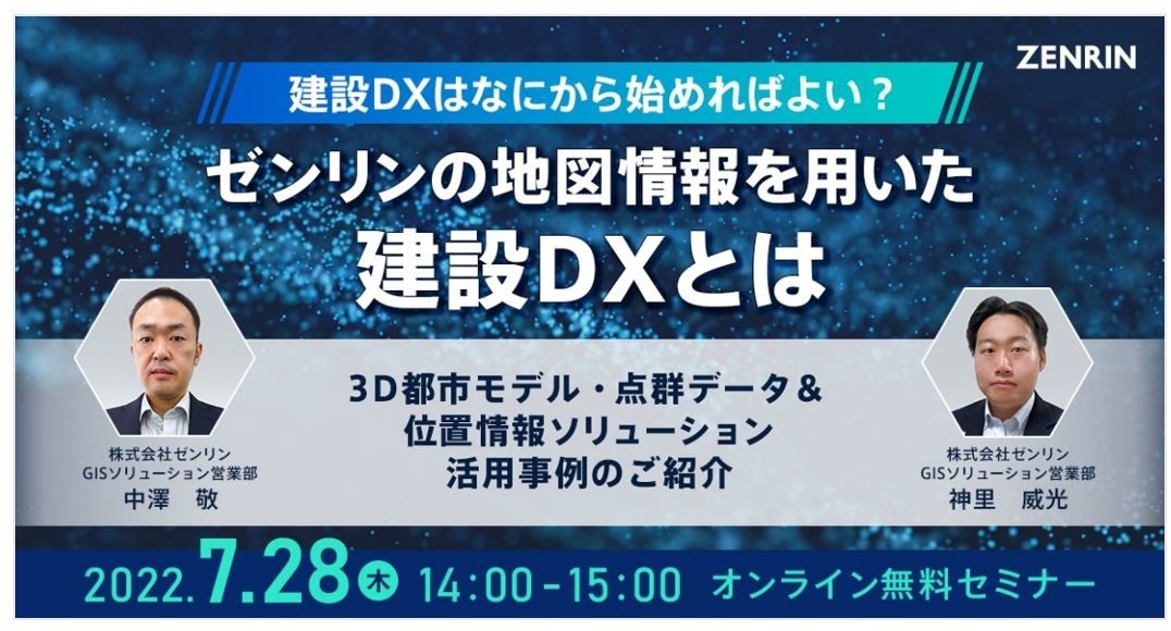 からの記事と詳細 ( 【7/28(木) オンライン無料セミナー】 「建設DXはなにから始めればよい? ゼンリンの地図情報を用いた建設DXとは」 - PR TIMES )