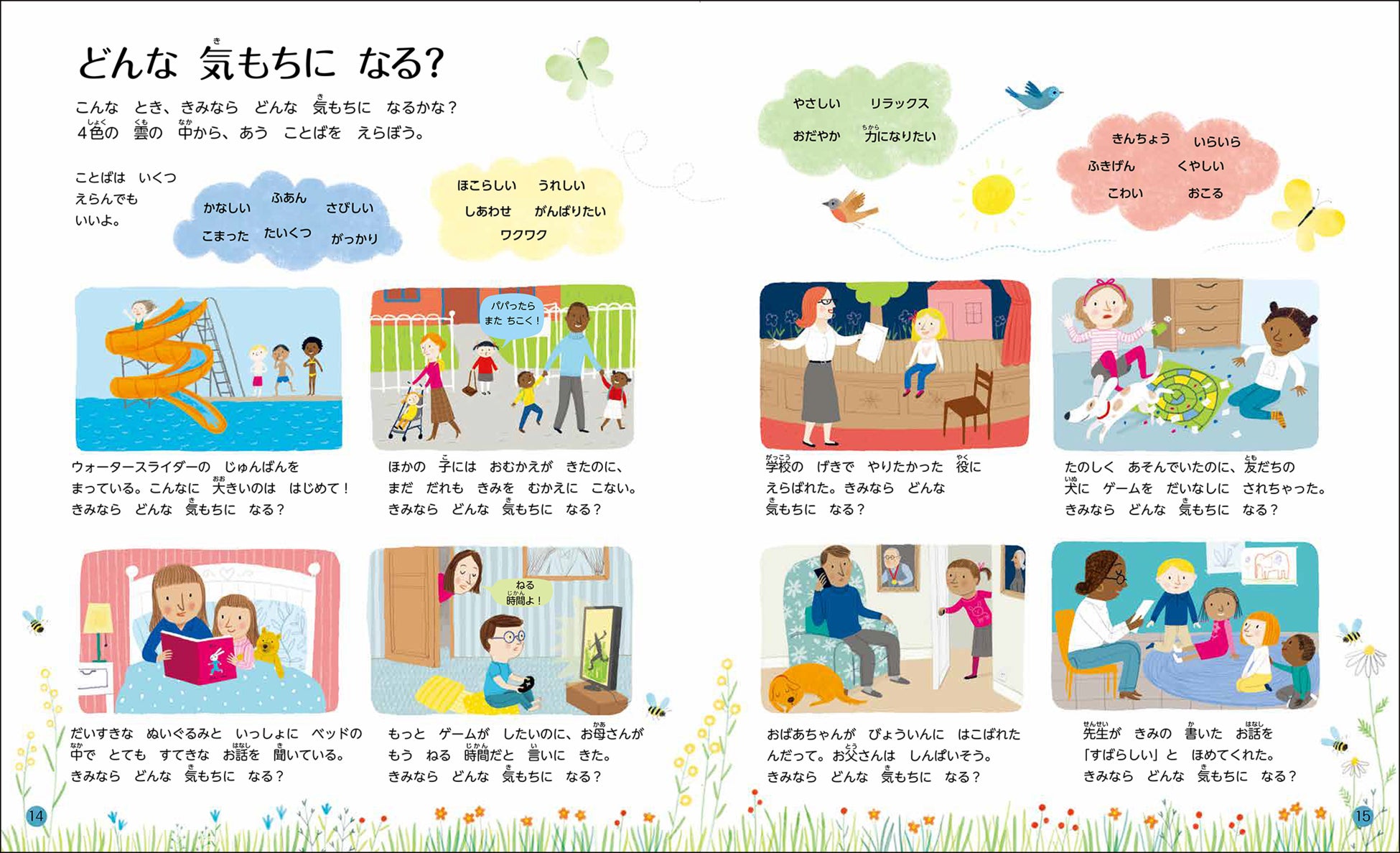 どんな気もちになる?/だれにだって気もちがある/体のサインいろいろ/きみは今どんな気もち?/いやな気もちになったら/友だちや家族をたすける etc.