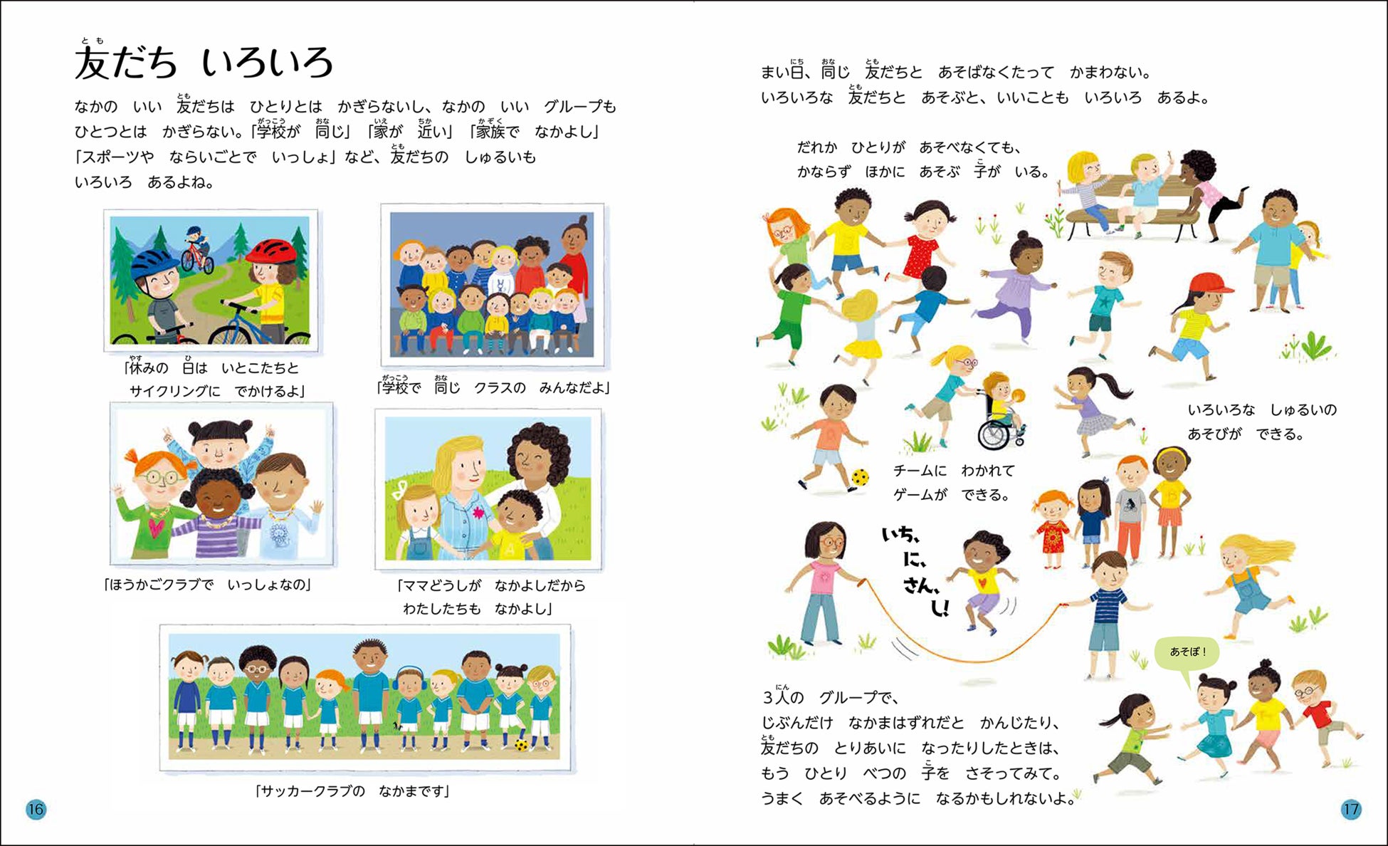 友だちいろいろ/友だちってなに?/どうして友だちがひつようなの?/友だちとなにをする?/なかなおりのほうほう/きみならどうする? etc.