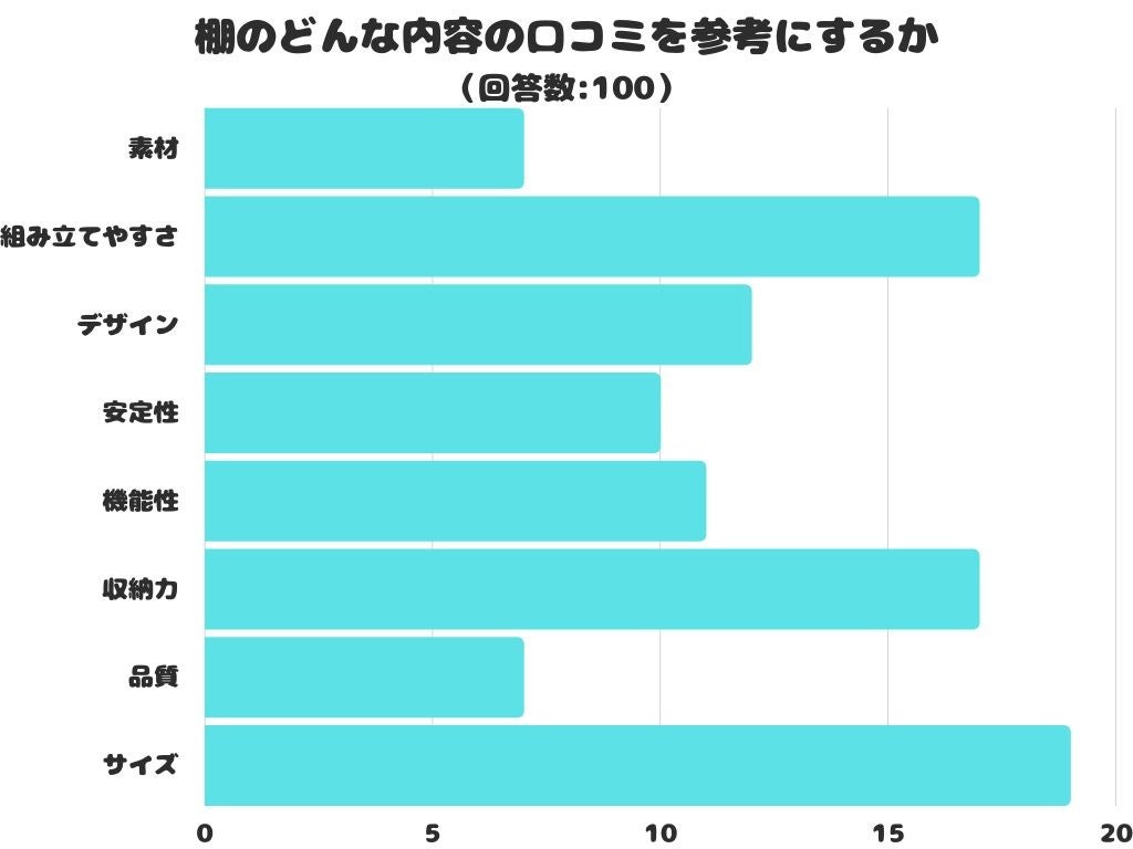 棚のどんな内容の口コミを参考にするかをアンケートにて調査したところ、1位は「サイズ」でした。